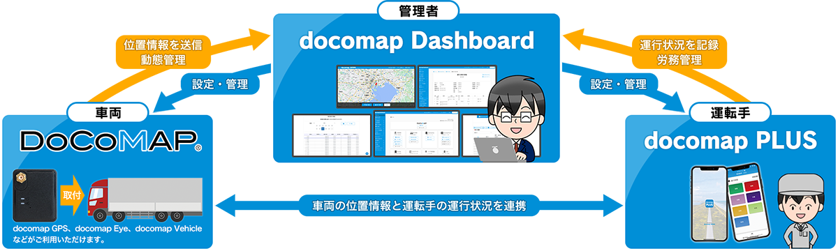 docomap Dashboardは、シンプルで分かりやすい管理者専用ページです。docomap GPS・docomap Eye端末やdocomap Vehicleから送信された位置情報と、DoCoMAP専用アプリケーションdocomap PLUSから送信された運行状況データをクラウド上で管理することができます。
