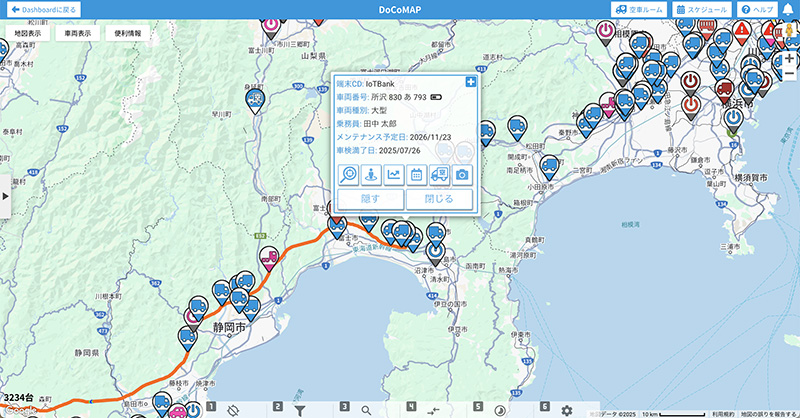 With DoCoMAP, you can display and manage the position of vehicles on Google Maps. It is also possible to directly use Google Maps functions such as traffic information and street view.