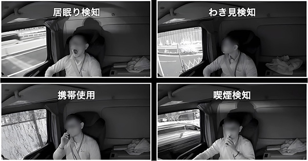 オプションのDMSカメラを取り付けることにより、ドライバーの居眠り運転、わき見運転、携帯電話の使用や喫煙動作がAI画像解析エンジンにより判定可能になります。