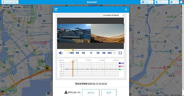 docomapEyeは、急ハンドルや急加減速などの危険挙動を検知時は自動的に前12秒・後8秒の合計20秒の映像と音声をクラウドにアップ。DoCoMAPの画面より、いつでもアップされた動画が確認できます。