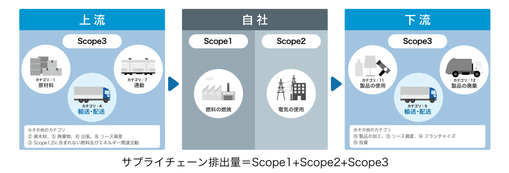 当社では、Scope3をキーワードとする配送時のCO2排出量の見える化に着目し、顧客別のScope3レポートが自動で作成される仕組みを2024年2月に群馬県デジタルイノベーション加速化事業補助金を得て開発しました。Scope3とは、自社が直接排出するCO2(Scope1)と、購入した電気などの使用に伴う間接排出(Scope2)以外の、製品の製造から廃棄までのライフサイクル全体で発生する排出量(Scope3)を指します。