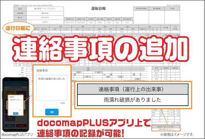 「連絡事項」新機能は、docomapPLUSユーザーの意見を取り入れたもので、運転手の運行中に発生した連絡事項を同アプリにて記録し、就業点呼後に運転手による運行日報への手書き作業を省略、業務効率化を目的として開発されました。
