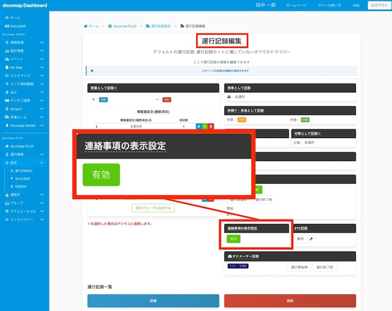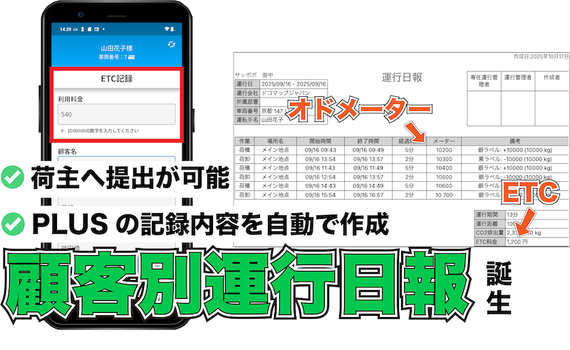 この度、「DoCoMAP」ユーザー専用の運転手向けスマートフォンアプリケーション「docomapPLUS」に、運行日報へ記録される「連絡事項」を新たに追加、更にETC料金やオドメーターを手動で記録し、顧客別に自動出力が可能な機能を追加しました。
