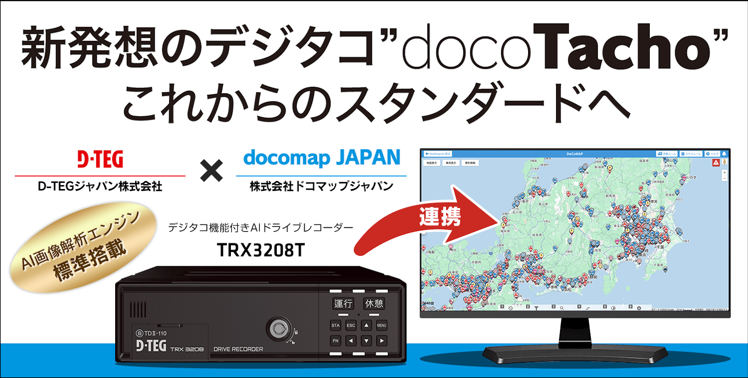 車両位置情報管理サービス「DoCoMAP※1(ドコマップ)」を提供する株式会社ドコマップジャパン(本社:東京都港区、代表取締役:浦嶋一裕、以下 ドコマップジャパン)は、D-TEGジャパン株式会社(本社:東京都港区、代表取締役:岩田勤、以下 D-TEGジャパン)が製造・販売するデジタルタコグラフ「TRX3208T※2」とDoCoMAPを連携させた新サービス「docoTacho(ドコタコ)」を、2026年5月より提供開始いたします。